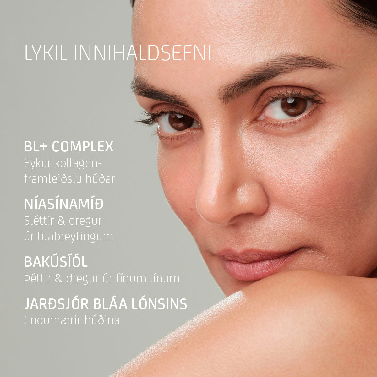 BL+ COMPLEX örvar nýmyndun kollagens, dregur úr niðurbroti kollagens og styrkir varnarlag húðarinnar. Við hönnun á BL+ COMPLEX er notuð náttúruleg fosfólípíðferja til þess að koma einstakri blöndu af einkaleyfisvörðum örþörungum og kísil Bláa Lónsins djúpt niður í húðlögin til að hámarka virkni. Einstakt innihaldsefni á heimsvísu sem finnst einungis í BL+ húðvörulínunni.