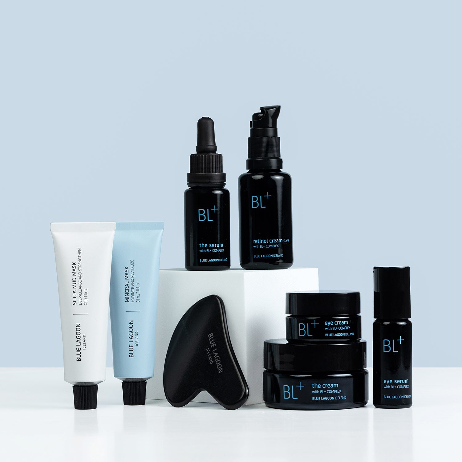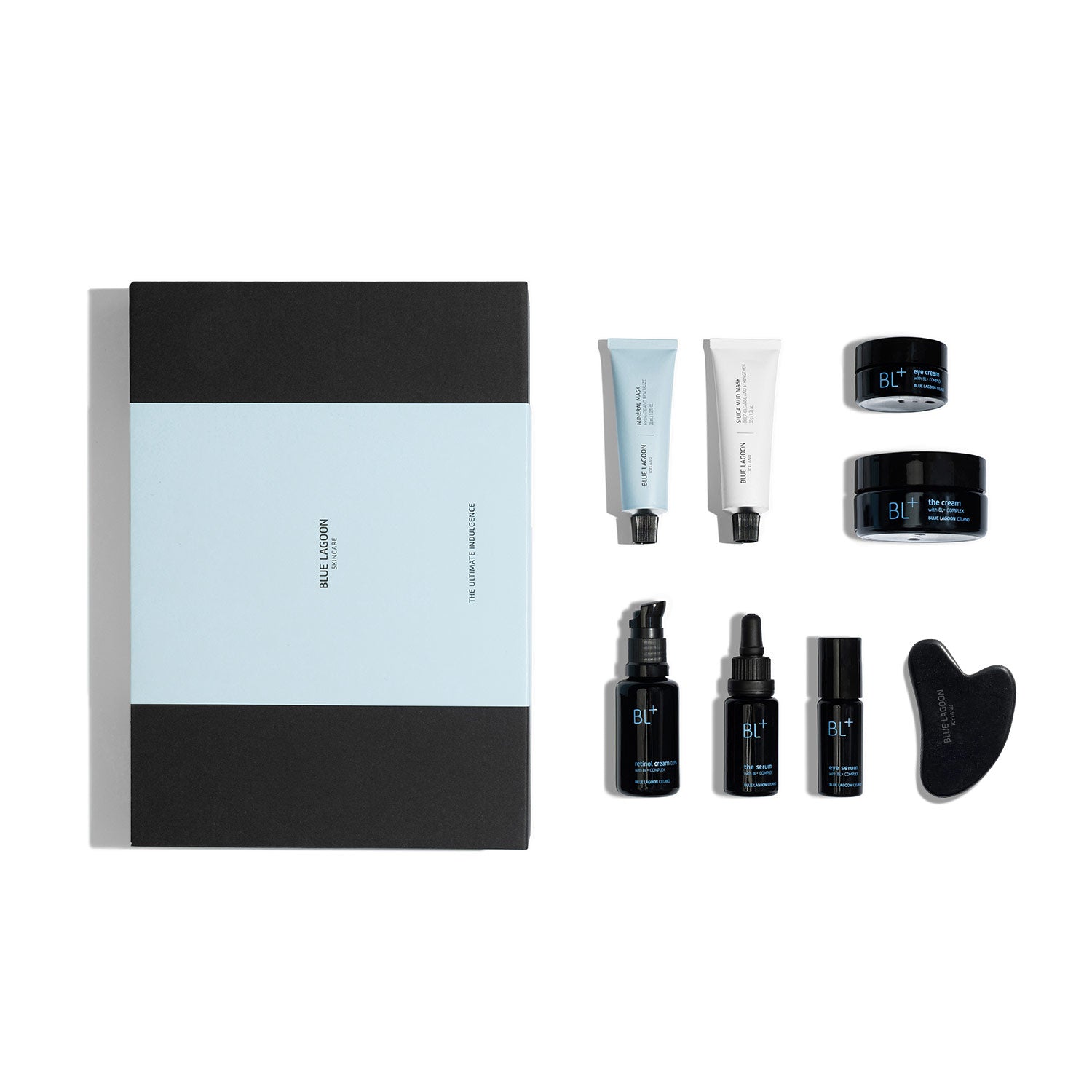 Settið inniheldur: BL+ Retinol Cream 0.3%(30 ml), BL+ The Serum (15 ml), BL+ The Cream (50 ml), BL+ Eye Serum (10 ml), BL+ Eye Cream (15 ml), Mineral Mask (30 ml), Silica Mud Mask (30 ml), og Blue Lagoon Skincare Gua Sha andlitsnuddstein.